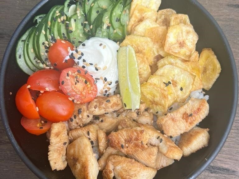 Arroz japonês e mix de folhas, frango grelhado, tomate cereja, pepino japonês, cream cheese, chips de banana verde, gergelim, toque de limão e molho geleia de maracujá.