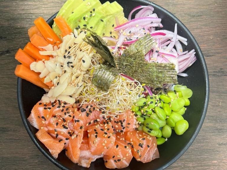 Arroz japonês e quinoa, salmão, abacate, cenoura, cebola roxa, brotos, edamame, amêndoas laminadas, gergelim, palha de nori e mostarda e mel