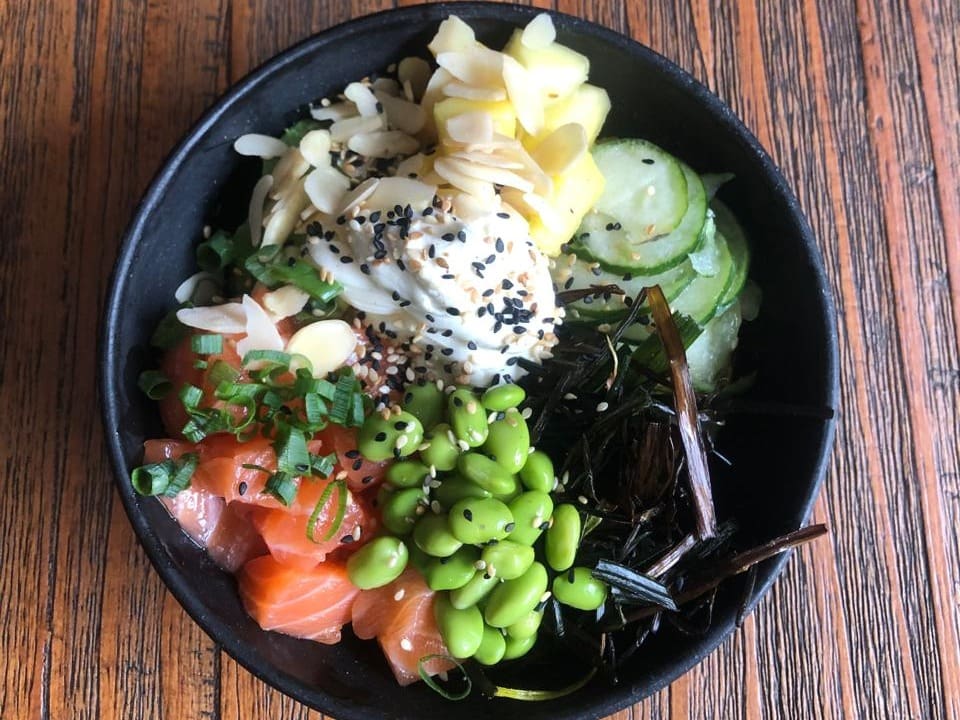 Salmão, abacate, manga, pepino japonês, palha de alho poró, cream cheese, edamame (soja verde), amêndoas laminadas, gergelim, cebolinha e molho tarê.