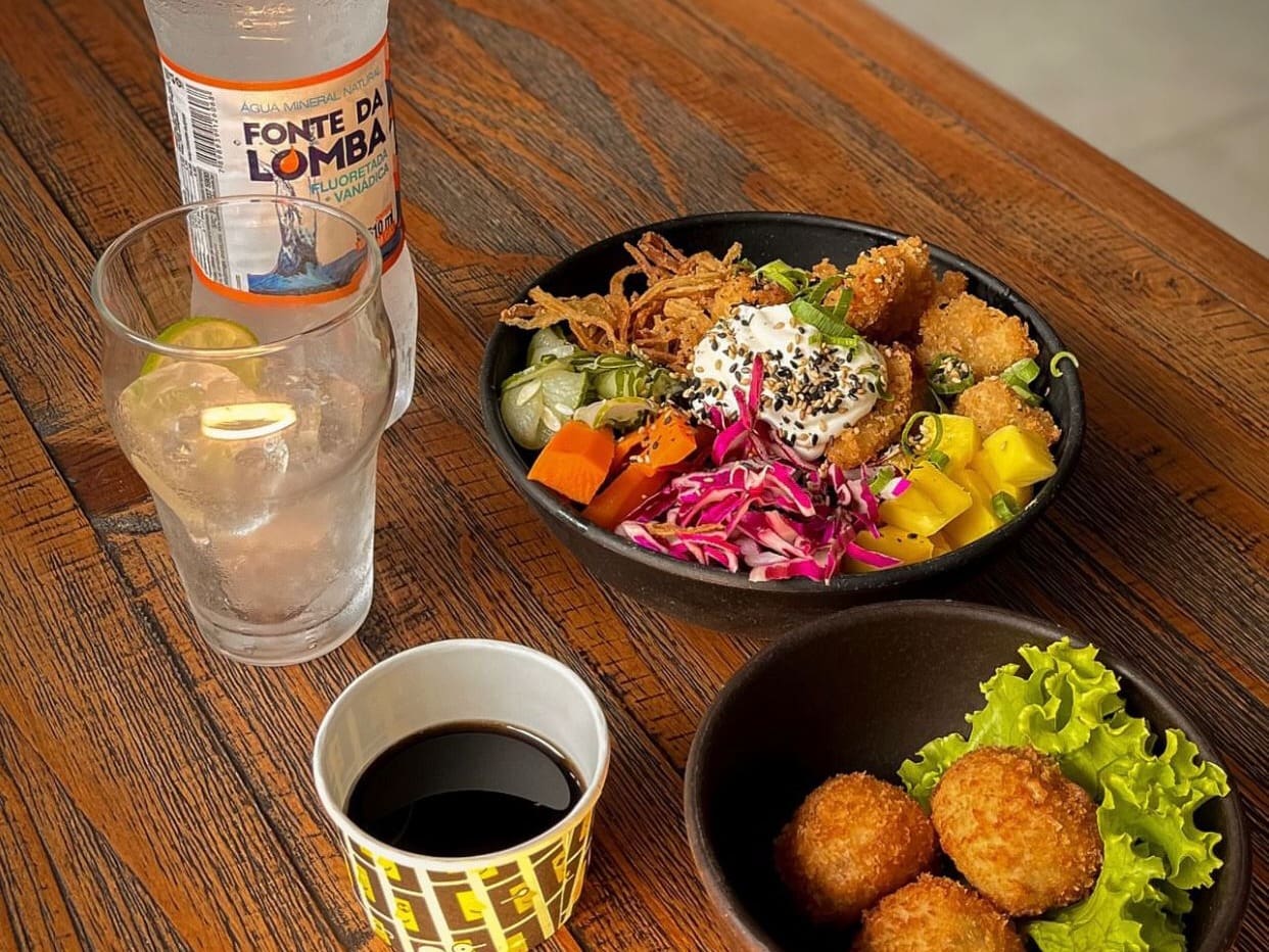 Tofu crocante, abacaxi, manga, pepino japonês, cream vegan, edamame (soja verde), lascas de coco, milho crunch, castanhas do pará, gengibre e molho tarê + entradinha + bebida.