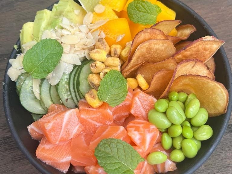 Mix de folhas e quinoa, salmão trufado (marinado no azeite de trufa), abacate, manga, pepino japonês, chips de batata doce, edamame, amêndoas laminadas, milho crunch, folhas de hortelã, toque de limão e molho de ervas.