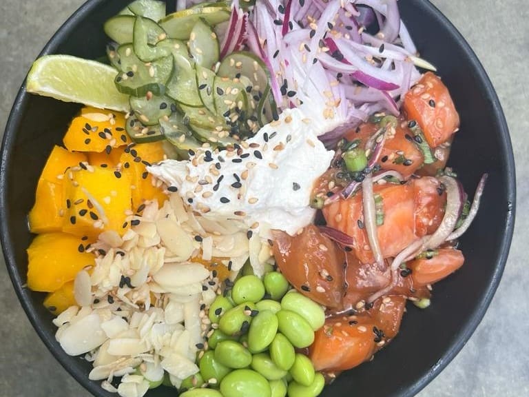 Mix de folhas e quinoa, salmão especial (marinado no tarê, cebolinha, cebola roxa e gergelim), cebola roxa, manga, sunomono, edamame, cream vegan, amêndoas laminadas, gergelim, toque de limão e molho havaiano.