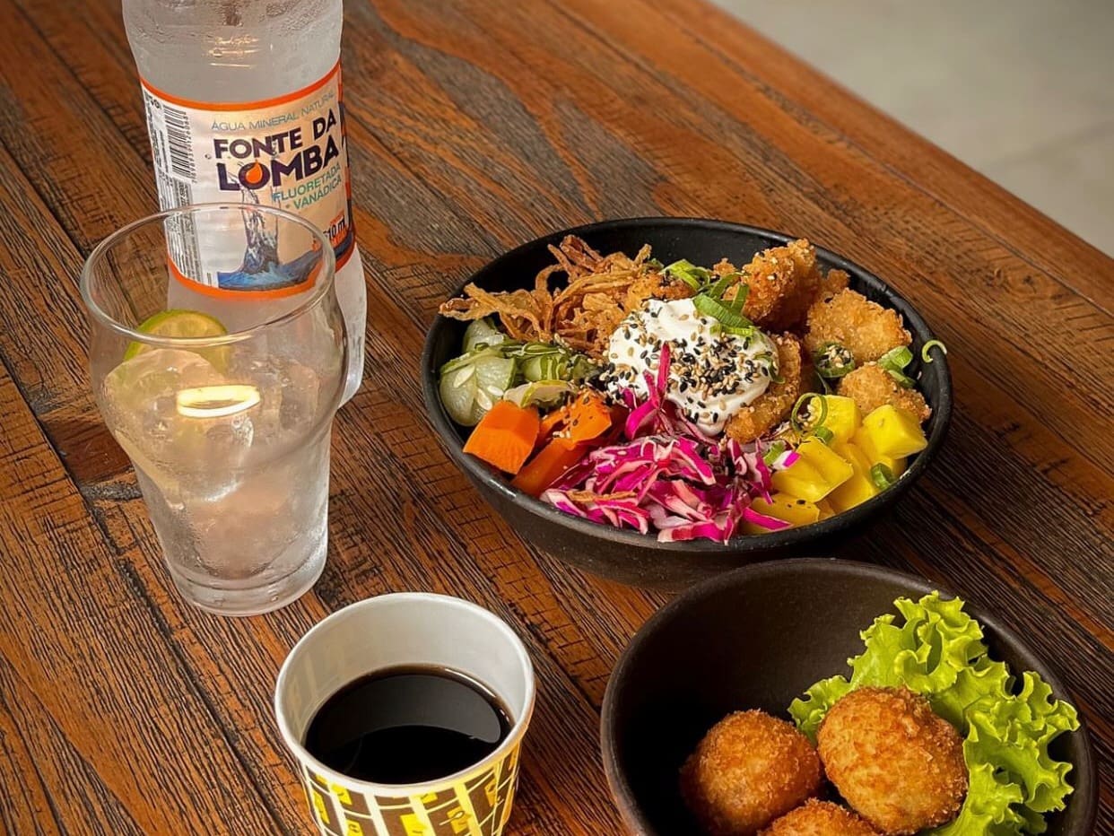 Salmão trufado (marinado no azeite de trufas), abacate, sunomono (conserva de pepino), cebola roxa, brotos, crispy de couve, palha de alho poró, amêndoas laminadas, mayo sriracha (picante), folhas de manjericão e molho havaiano + entradinha + bebida.
