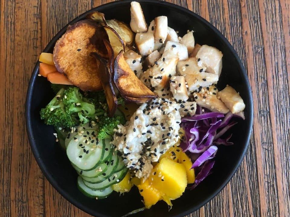 Frango grelhado, pepino japonês, manga, cenoura, repolho roxo, brócolis, chips de batata doce, cream figo (cream cheese com figo), gergelim e molho de ervas.