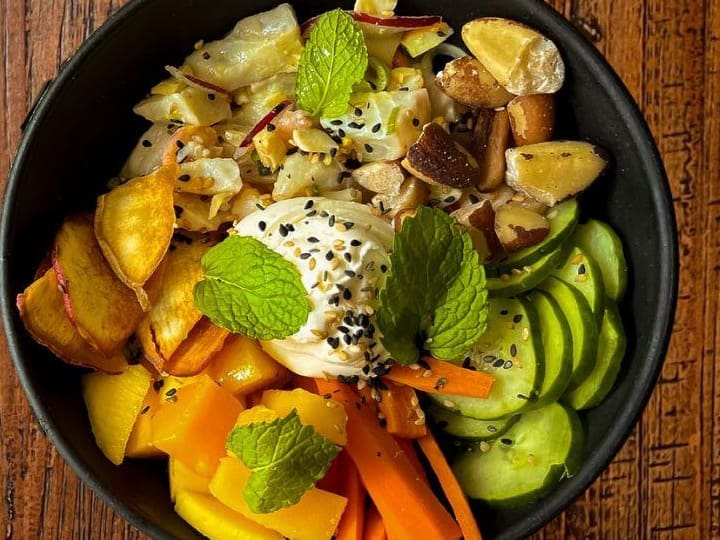 Salmão trufado, abacate, sunomono (conserva de pepino), cebola roxa, brotos, crispy de couve, palha de alho poró, amêndoas laminadas, mayo sriracha (picante), folhas de manjericão e molho havaiano.