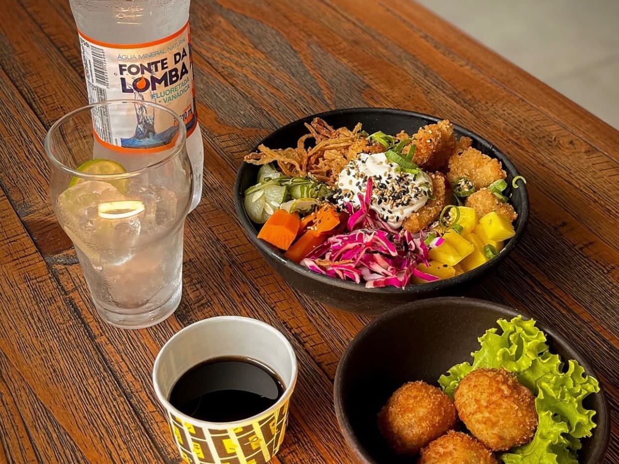 Fish finger (iscas de tilápia empanadas com panko), pepino japonês, abacaxi, tomate cereja, crispy de batata doce, cream figo, cebola crispy, palha de nori, cebolinha, amêndoas laminadas, gergelim, molho tarê + entradinha + bebida.