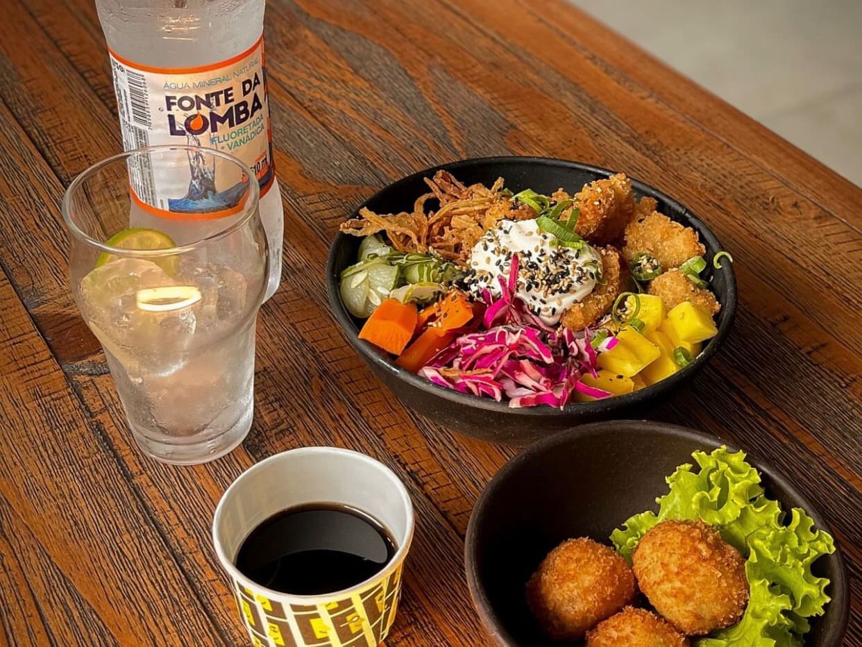 Atum marinado no molho de ervas, manga, repolho roxo, alho poró in natura, brotos, cream cheese, chips de banana verde, cebolinha, gergelim e molho havaiano + entradinha + bebida.