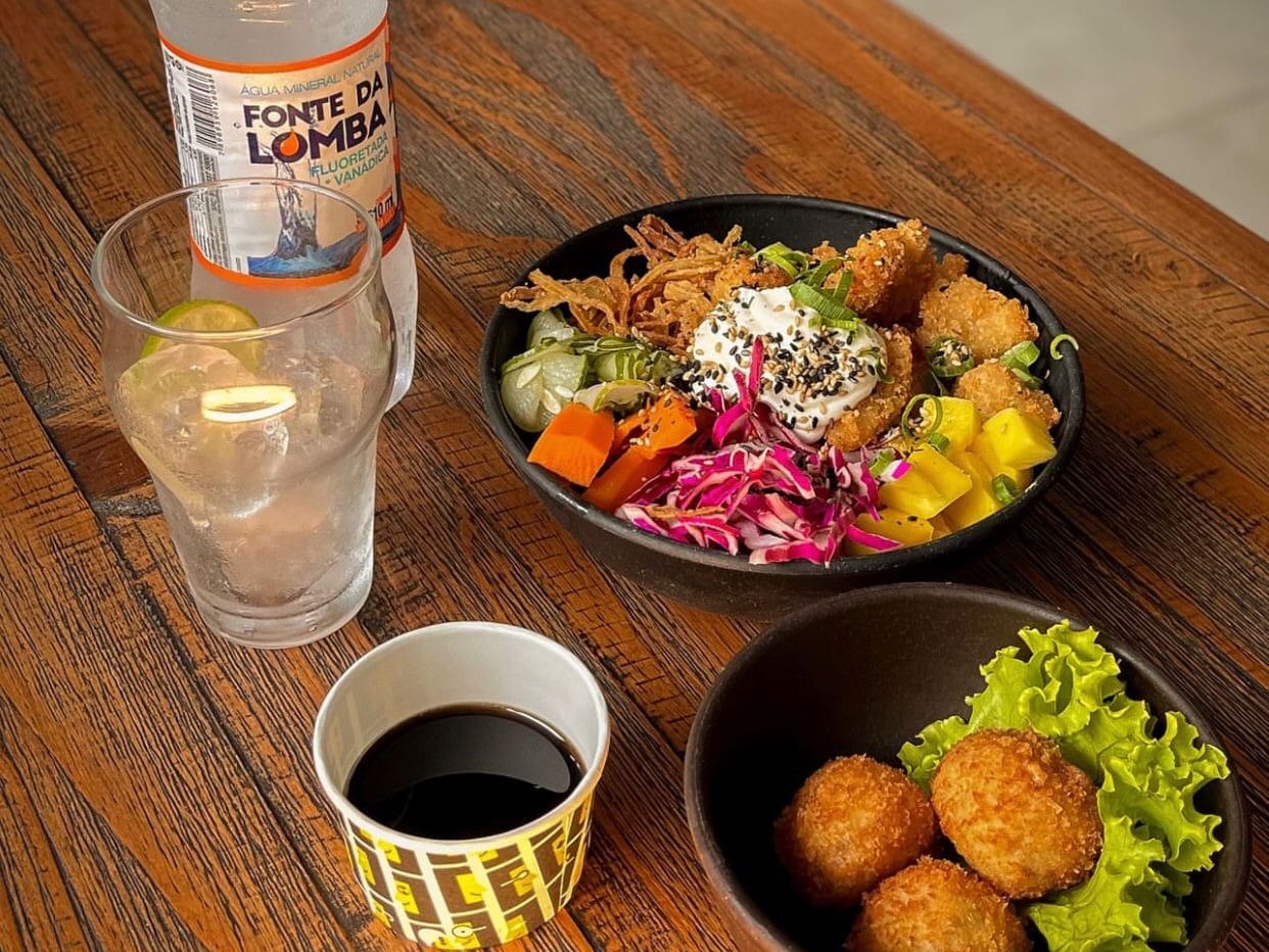 Fish finger (iscas de tilápia empanadas com panko), pepino japonês, abacaxi, tomate cereja, crispy de batata doce, cream figo, cebola crispy, palha de nori, cebolinha, amêndoas laminadas, gergelim, molho tarê + entradinha + bebida.